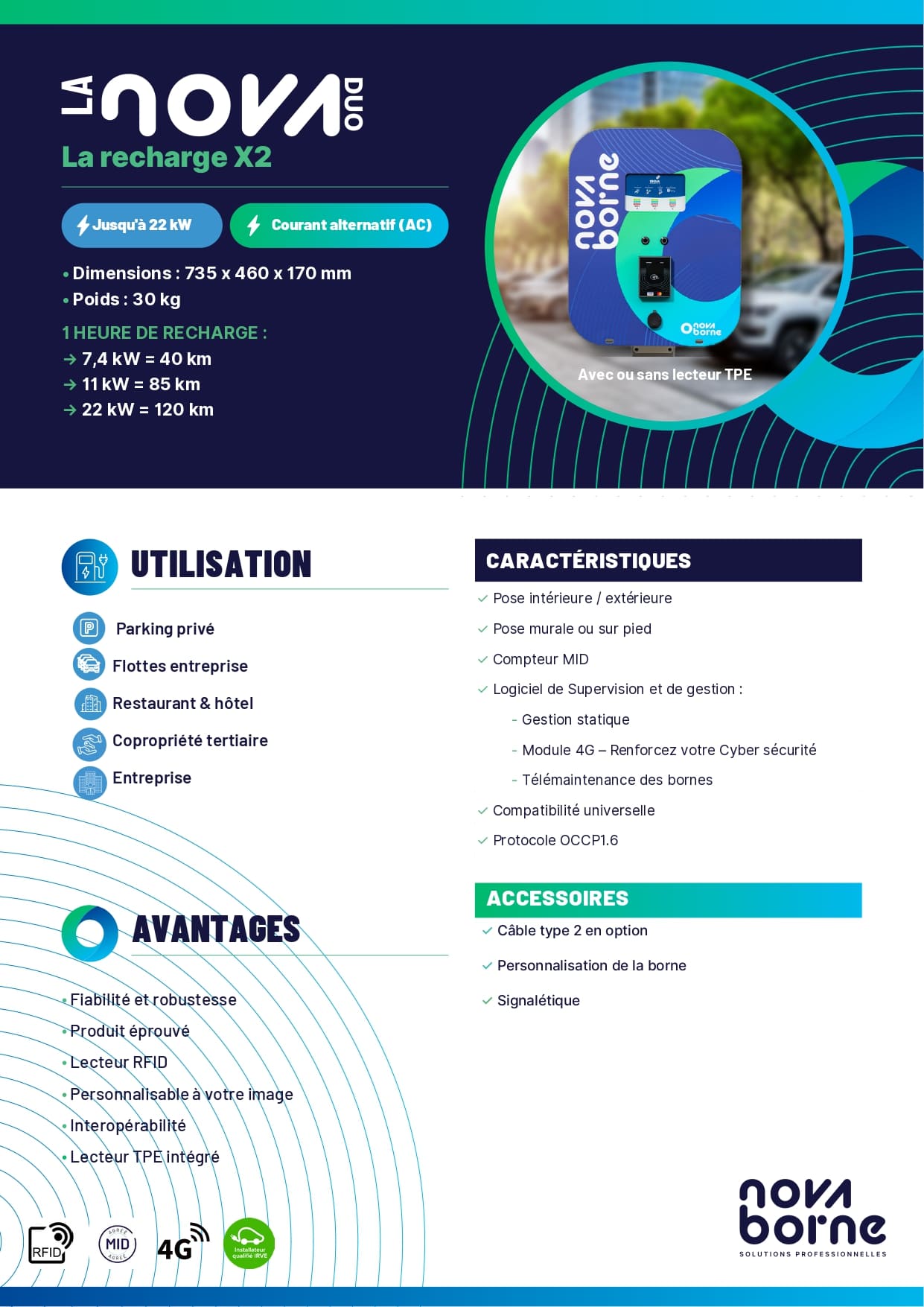 Entrez dans l’ère de la recharge intelligente avec la location de borne NOVA DUO équipée d’un TPE intégré.